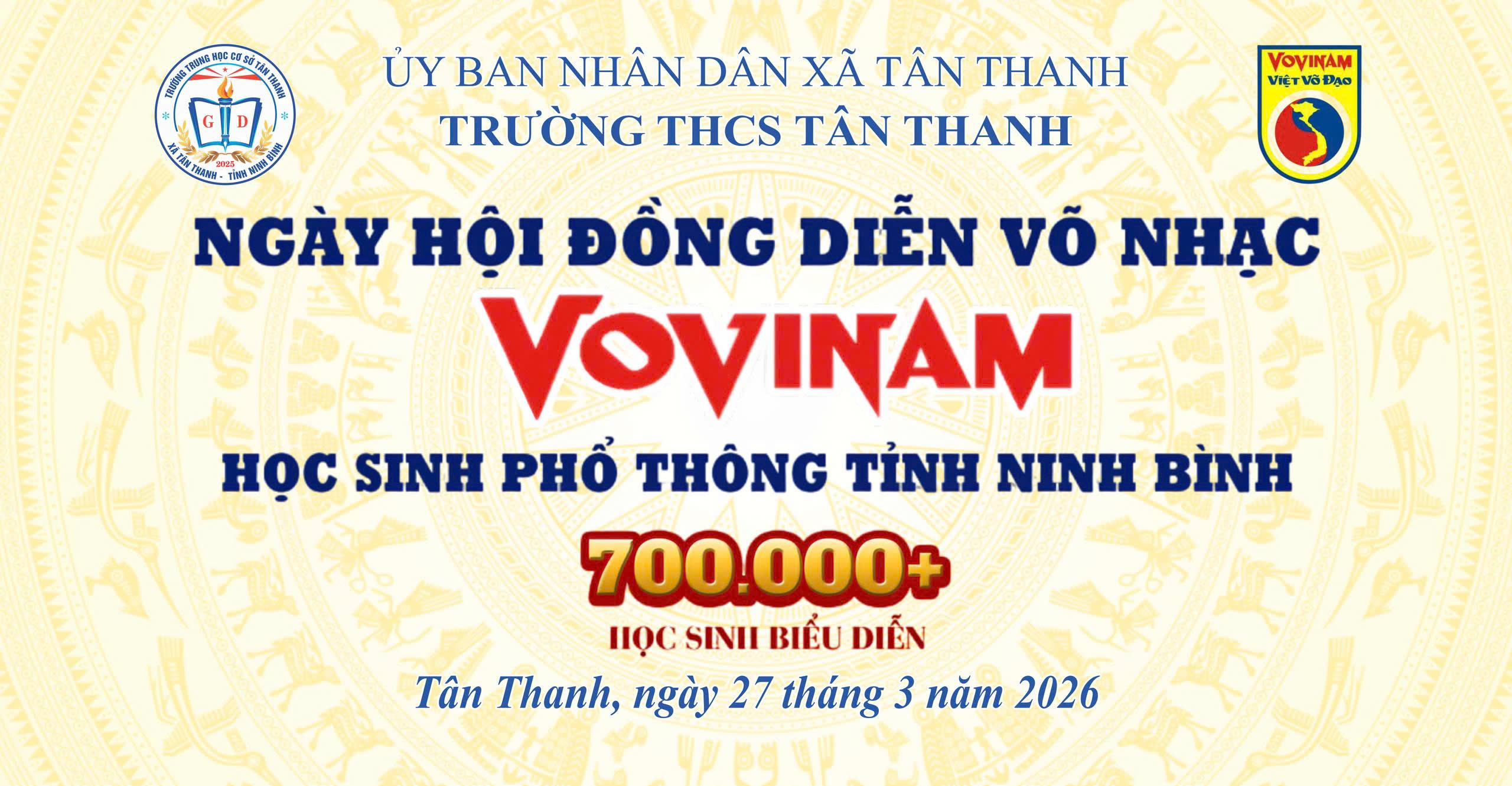 Đúng 9h sáng ngày 27/3/2026, toàn bộ 752 học sinh trường THCS Tân Thanh, xã Tân Thanh, tỉnh Ninh Bình cùng hơn 730 nghìn học sinh phổ thông tại 1.047 trường tiểu học, trung học cơ sở và trung học phổ thông trên địa bàn tỉnh Ninh Bình tham gia Chương trình đồng diễn Ngày hội Võ nhạc Vovinam.